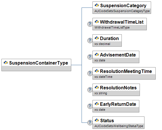 | WellbeingEventSubCategory | MR | union of: AUCodeSetsEventSubCategoryType xs:string |