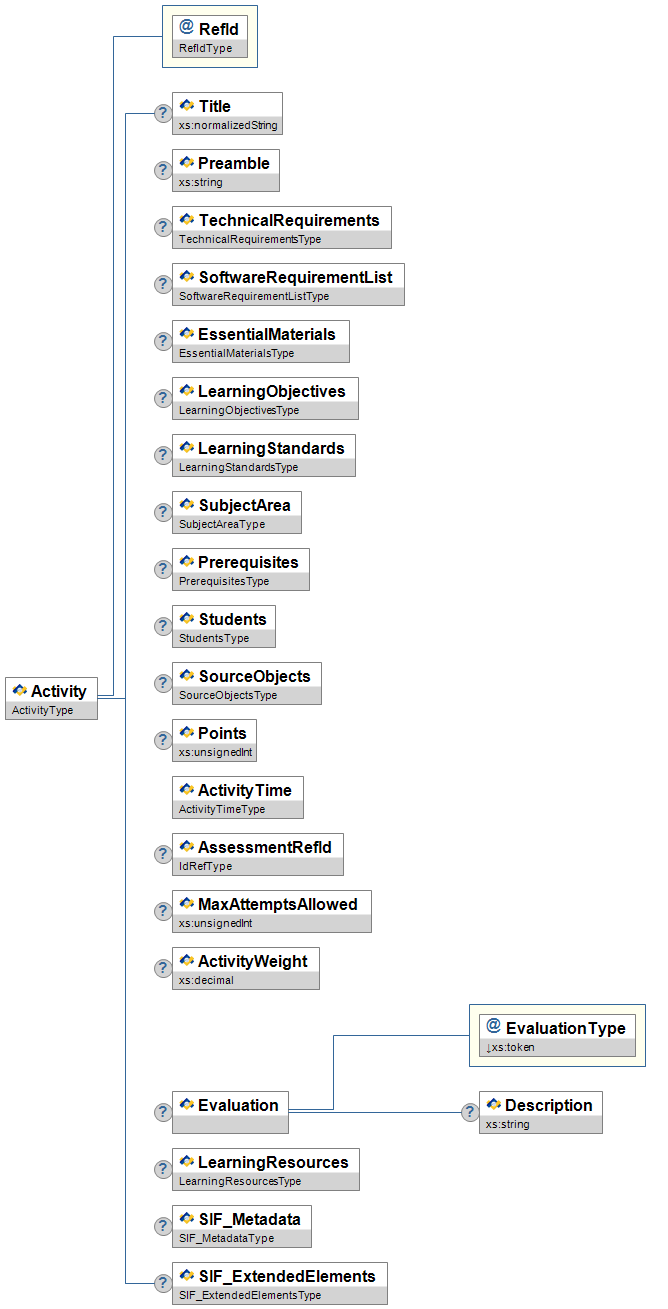 | AssessmentRefId | O | Low | Link to the SIF Assessment object containing the evaluation information for this activity. | IdRefType | |