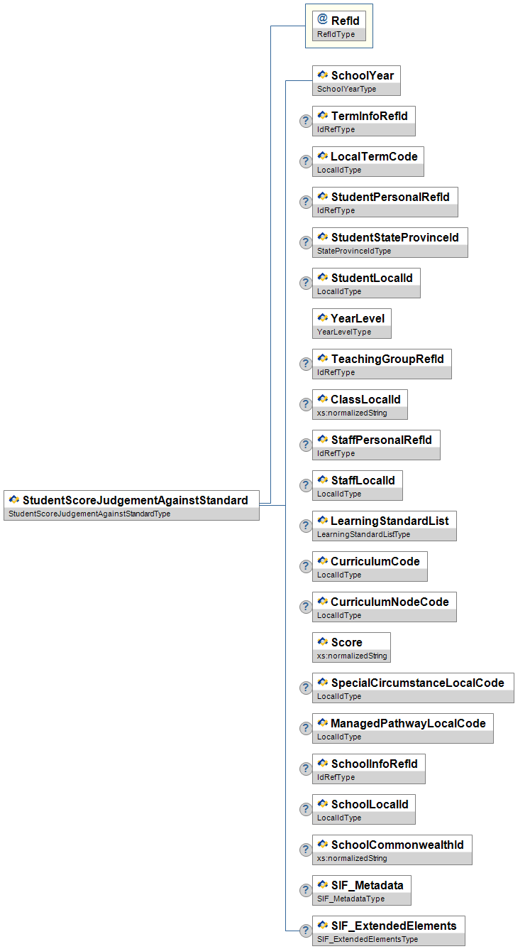 | StudentScoreJudgementAgainstStandard | High | This object serves to represent a student's score (score in the form of a teacher judgement against written achievement standards), which has been recorded against a curriculum node (the curriculum node belongs to a curriculum structure), which was taught as part of a school-defined class, during a specific reporting period. | |||