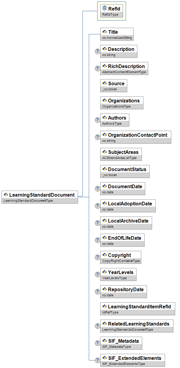 | LearningStandardDocumentRefId | M | Low | The RefId of the item's parent LearningStandardDocument. | IdRefType | |