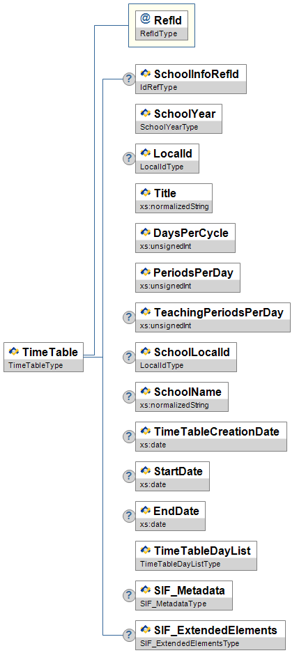| TimeTable | Low | The purpose of this object is to define a schedule or Time Table structure/skeleton for the school. The Time Table is produced by the Time Tabling software. Once the Time Table is produced, the time tabling software creates the schedule based on business rules and constraints to fit into the time table structure. The proposed Time Table object is based on a combination of the proposed UK B6 – Timetable Cycle Object and Timetable Scope Object. The Time Table is identified uniquely in the SIF Zone by its GUID, School and School Year. A Time Table is linked to a particular school. All local ids in non-authoritative objects are optional. It is therefore up to the provider and the actual agent's design and choreography to determine whether or not to use or local ids from parent objects. There are cases in some subscribing systems where it might not possible to add RefId columns and therefore the RefId of related objects cannot be stored. For example a target system that listens to TimeTableSubject events and updates them may not be able to store the associated SchoolCourseInfoRefId with that object. The only way it can link the TimeTableSubject object with the appropriate course might be through its local course id. Having local ids that link the parent objects with the child object can simplify the agent design. Generally it is suggested to use the appropriate RefIds whenever possible and only use local ids if there is no other way to use RefIds. | |||