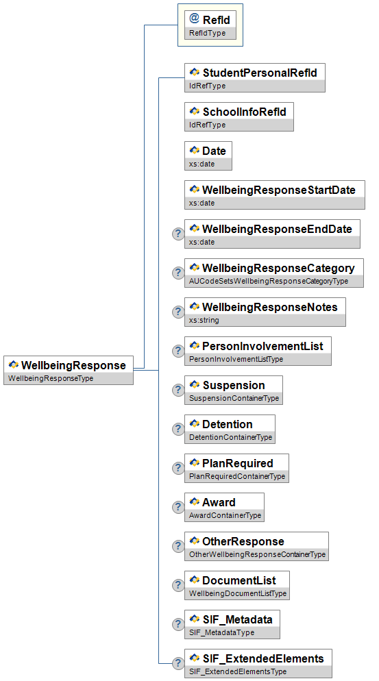 | WellbeingResponseCategory | C | High | Category of WellbeingResponse. | AUCodeSetsWellbeingResponseCategoryType | |