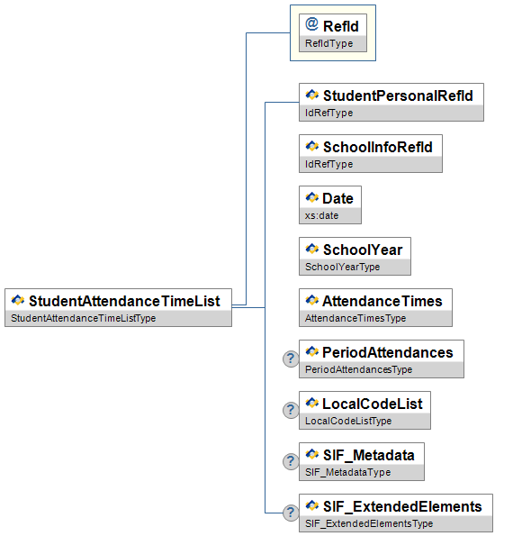 | SchoolInfoRefId | M | Low | The school where the attendance was recorded. Somewhat redundant, needed for requests. | IdRefType | |