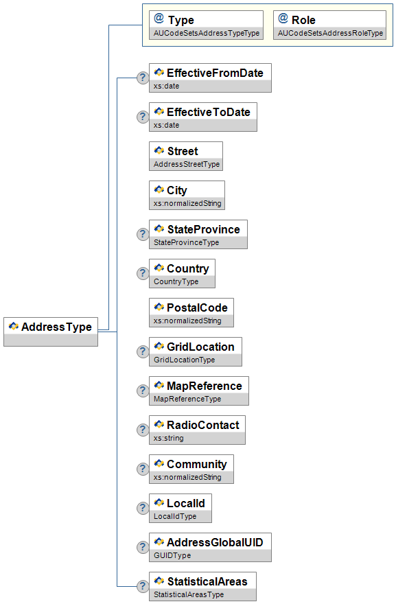 | @ | Type | M | Code that defines the location of the address. Note: A subset of specific valid values for each instance in a data object may be listed in that object. | AUCodeSetsAddressTypeType |