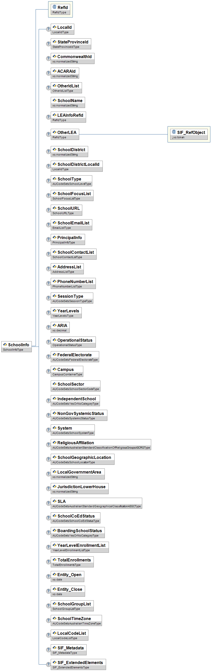 | SchoolTimeZone | O | Low | An optional placeholder for a schools time zone. | AUCodeSetsAustralianTimeZoneType | |