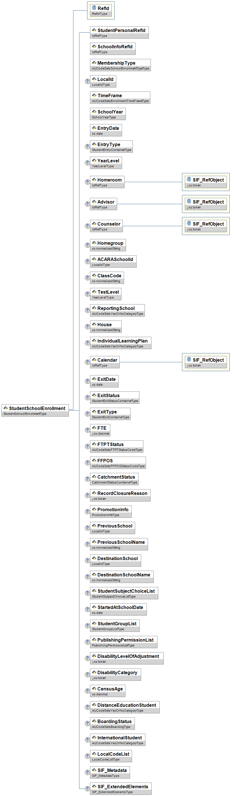 | MembershipType | M | Low | The type of this enrollment as it relates to the school identified in SchoolInfoRefId. | AUCodeSetsSchoolEnrollmentTypeType | |||||||