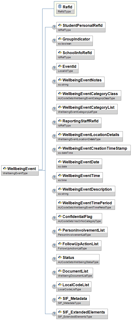 | WellbeingEventCategoryClass | M | High | Category of WellbeingEvent. | AUCodeSetsWellbeingEventCategoryClassType | |