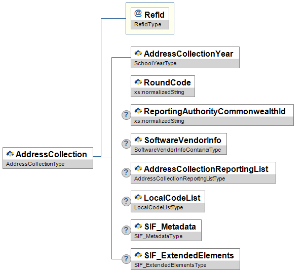 | AddressCollection | High | Object for Australian Government collection submission collecting addresses of students from schools and school authorities | |||