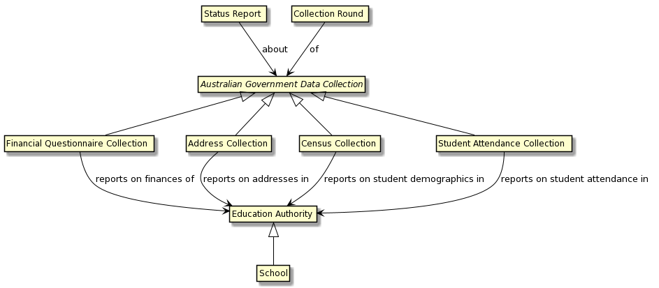 | A Collection Round is of an Australian Government Data Collection | CollectionRound, {FinancialQuestionnaireCollection, AddressCollection, CensusCollection, StudentAttendance} |