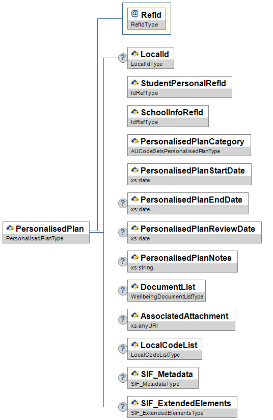 @![]() | RefId | M | High | The ID (GUID) assigned to uniquely identify this PersonalisedPlan. | RefIdType |