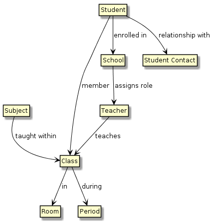 | A Student is a member of a Class | StudentPersonal, TeachingGroup; StudentPersonal, StudentSectionEnrollment, SectionInfo |