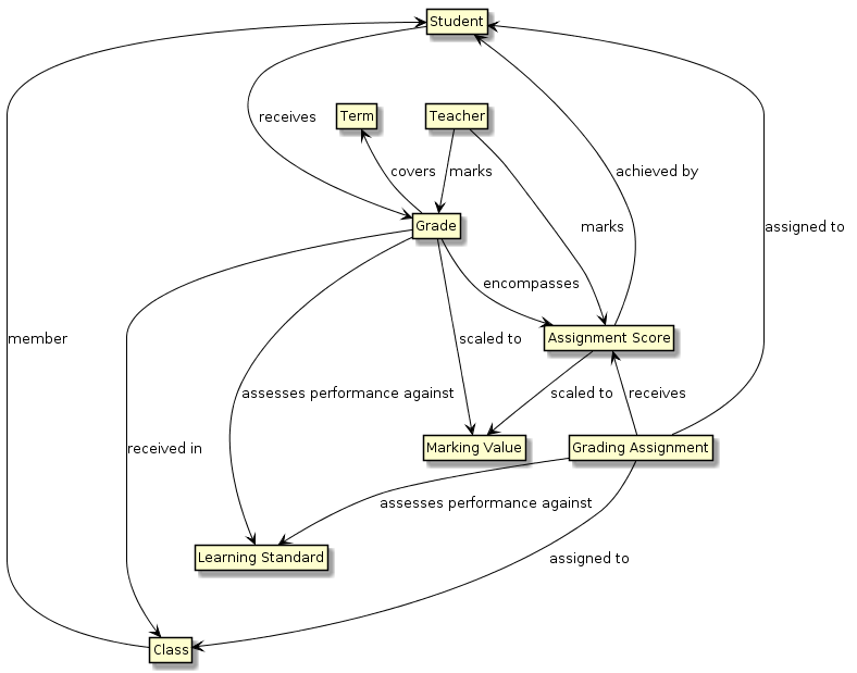 | A Grade covers a Term | {StudentGrade, StudentScoreJudgementAgainstStandard}, TermInfo |