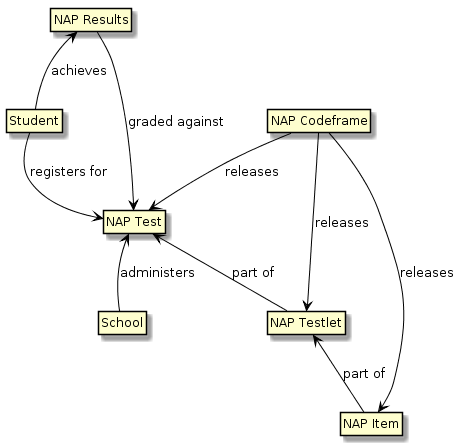 | NAP Results are graded against a NAP Test | NAPStudentResponseSet, NAPTest; aggregated: NAPTestScoreSummary, NAPTest |