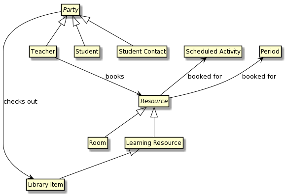 | A Resource may be booked for a Scheduled Activity | {RoomInfo, EquipmentInfo, LearningResource}, ResourceBooking, ScheduledActivity |