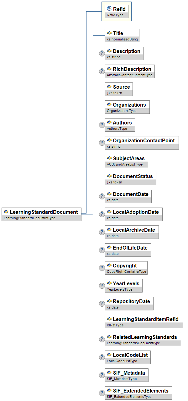 | LearningStandardDocumentRefId | M | Low | The RefId of the item's parent LearningStandardDocument. | IdRefType | |