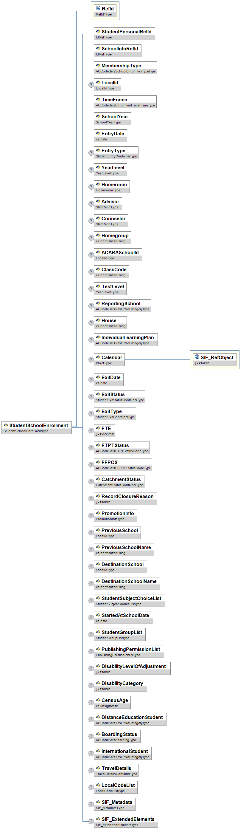 | MembershipType | M | Low | The type of this enrollment as it relates to the school identified in SchoolInfoRefId. | AUCodeSetsSchoolEnrollmentTypeType | |||||||