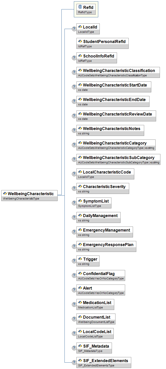 | WellbeingCharacteristicCategory | O | High | Category of WellbeingCharacteristic. | union of: AUCodeSetsWellbeingCharacteristicCategoryType xs:string | |