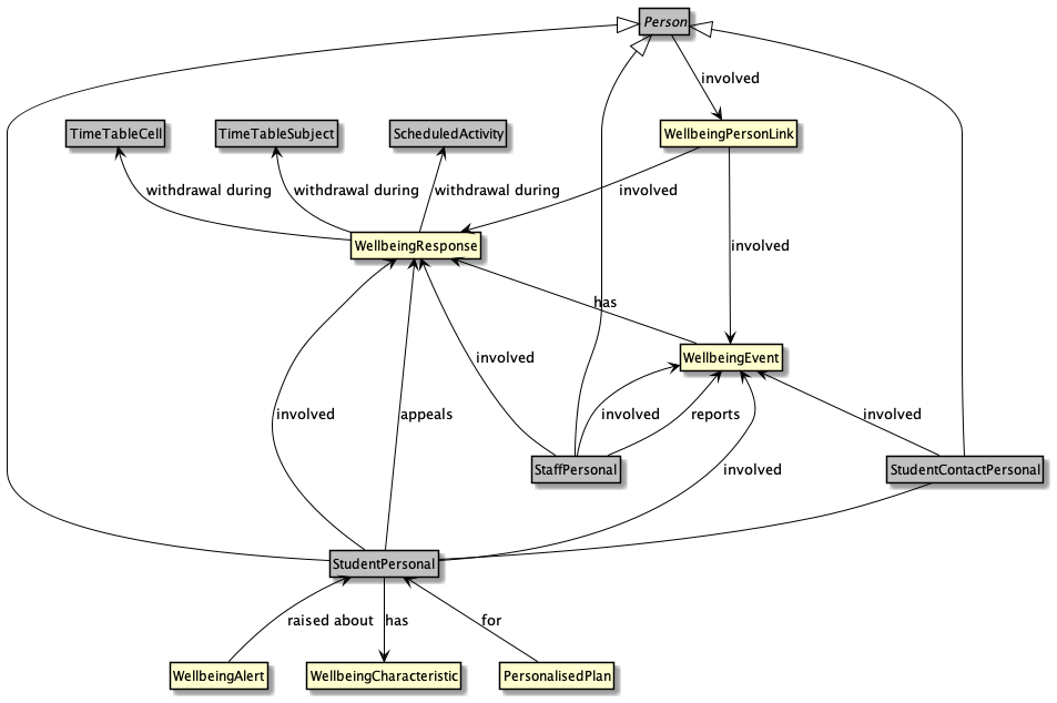 | WellbeingAppeal | High | A WellbeingAppeal is information about an "appeal" or a "request" in regard to a (negative/punitive) WellbeingResponse to a student event. | |||