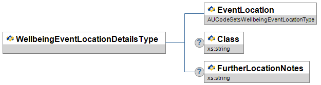 | EventLocation | M | Categorisation of location of Wellbeing event. | AUCodeSetsWellbeingEventLocationType | |