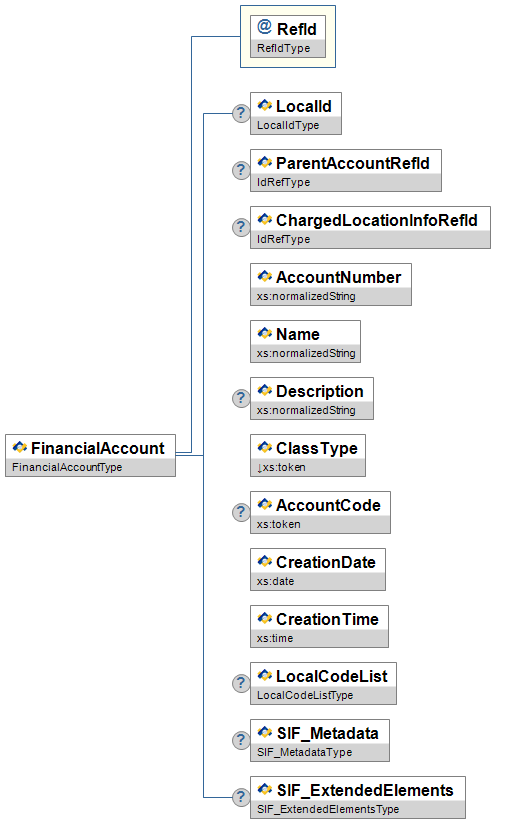 | ParentAccountRefId | O | High | Identifier of a parent account of the account. Can be used to construct a hierarchical tree of nesting accounts, e.g. "Revenue" -- "Revenue-Grant" -- "Revenue-Grant-Commonwealth". | IdRefType | |
