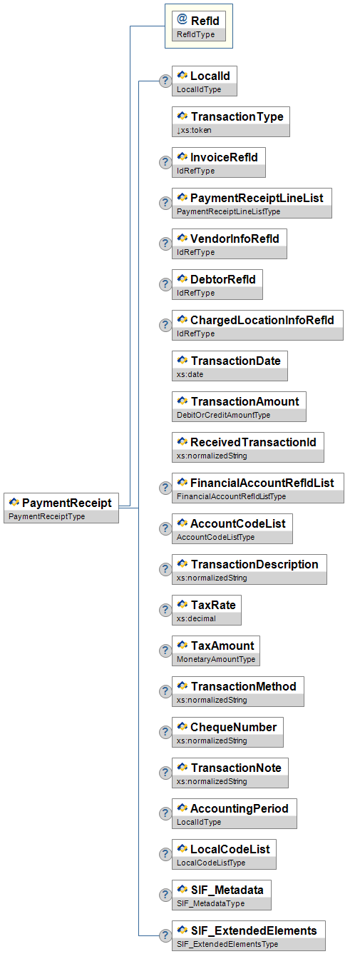 | PaymentReceiptLineList | O | High | A List of pointers back to the Invoice object corresponding to this payment. Is omitted for general ledger transactions, creditor receipts and debtor payments. To be used when this payment is associated with more than one invoice. | PaymentReceiptLineListType | |