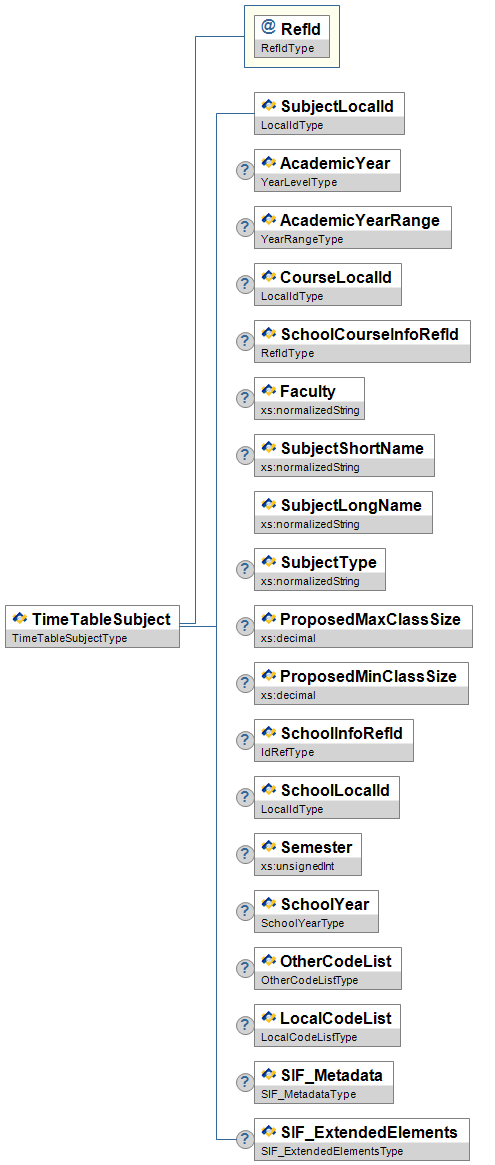 | SubjectLocalId | M | Low | SubjectLocalID - Distinct piece of curriculum that is to be scheduled. | LocalIdType | |
