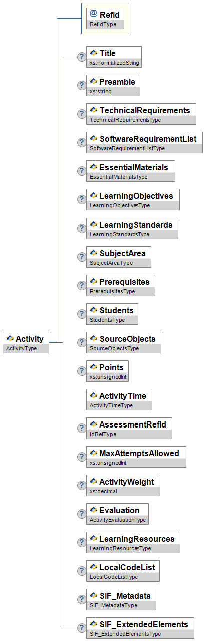 | AssessmentRefId | O | Low | Link to the SIF Assessment object containing the evaluation information for this activity. | IdRefType | |