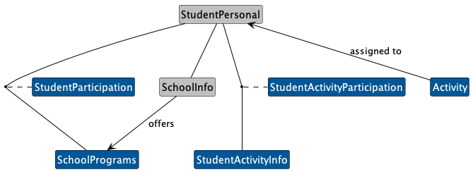 | StudentActivityInfo | Low | Co-curricular or extra-curricular activities (e.g., student organizations, inter-school sports, athletics, publications, band, orchestra, and service activities) in which students may participate. | |||