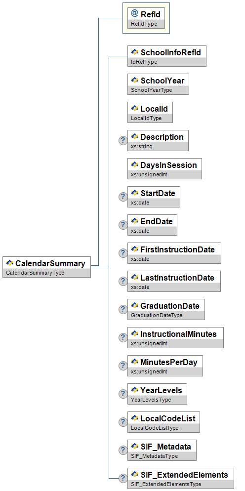 | CalendarDate | Low | This object defines information related to a school calendar day in a given school calendar year. If both CalendarDate and CalendarSummary objects are supported, there must be an instance of this object for each date between CalendarSummary StartDate and EndDate, inclusive. | |||