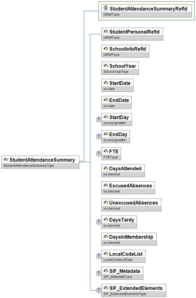 Figure 3.4.4-1: StudentAttendanceSummary| Element/@Attribute | Char | Privacy Rating | Description | Type | |