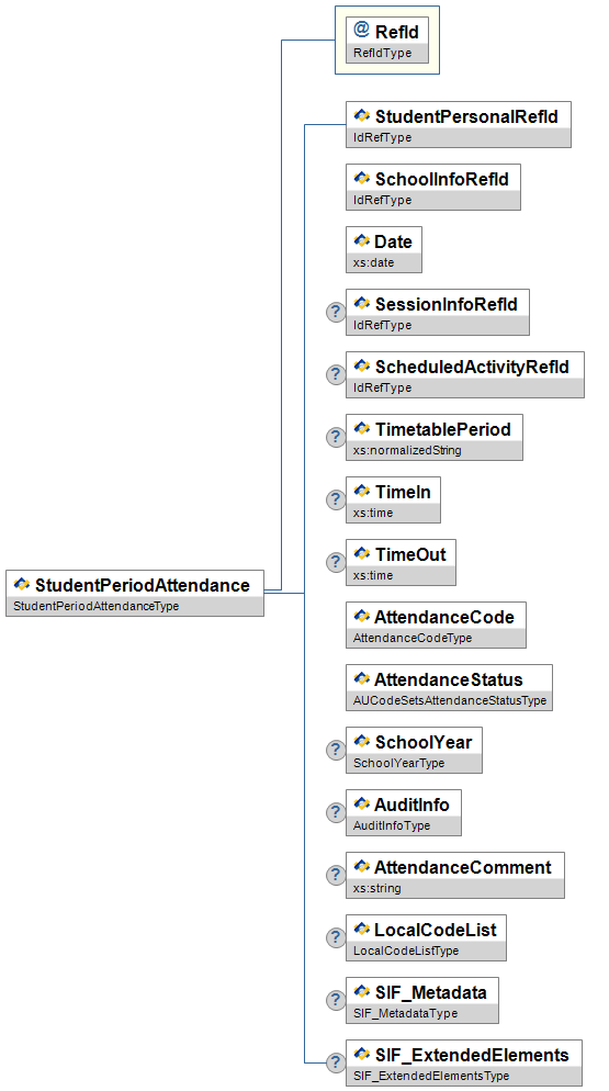 | SchoolInfoRefId | M | Low | The school where the attendance was recorded. Somewhat redundant, needed for requests. | IdRefType | |