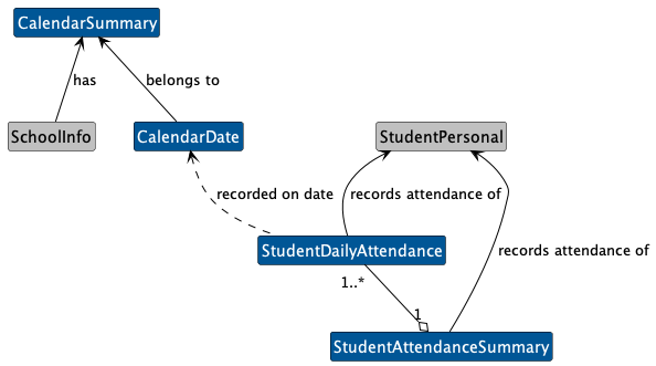 | StudentAttendanceSummary | Low | This object provides a summary of a student's daily attendance and membership information for a given school during the time period between the StartDate and EndDate, inclusive. As such, there may be multiple instances of this object for a student in a school over the course of a school year. | |||