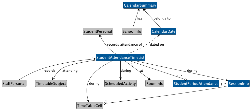| SessionInfo | Low | This object provides the link between Period Attendance and the school's timetable. It allows subject and teaching group information to be communicated to/from the attendance system. This object provides information about the session; the specific instance of a timetable cell against which the attendance is recorded. Please note, the TimeTableCell object represents a session scheduled in a timetable. There may be many SessionInfo objects for the same TimeTableCell each for a different week/fortnight, depending on the length of the timetable schedule. Attendance is recorded against the SessionInfo object. | |||