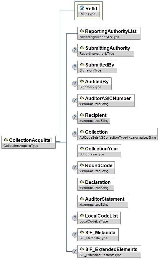 | CollectionAcquittal | High | Object providing a record of the acquittal of a collection object submitted as part of vertical reporting. The object is in the first instance provided for the acquittal of the Australian Government Financial Questionnaire Collection, but is intended to be generalisable to other collections requiring acquittal. | |||