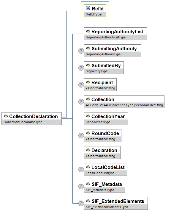 | CollectionDeclaration | High | Object providing a record of the declaration of a collection object submitted as part of vertical reporting. The object is in the first instance provided for the Australian Government collection objects, but is intended to be generalisable to other collections requiring declarations. | |||
