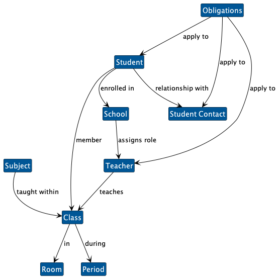 | A Student is a member of a Class | StudentPersonal, TeachingGroup; StudentPersonal, StudentSectionEnrollment, SectionInfo |