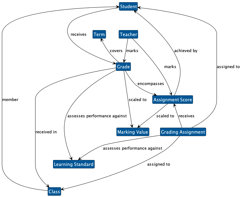 | A Grade covers a Term | {StudentGrade, StudentScoreJudgementAgainstStandard}, TermInfo |