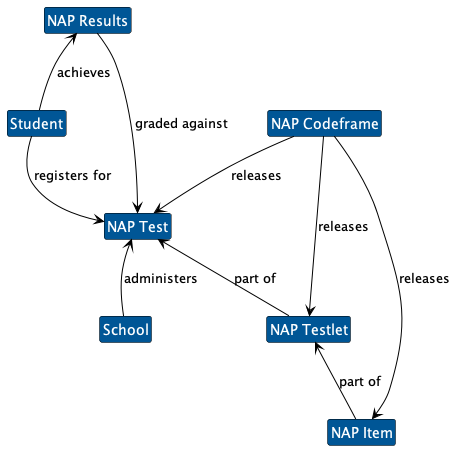 | NAP Results are graded against a NAP Test | NAPStudentResponseSet, NAPTest; aggregated: NAPTestScoreSummary, NAPTest |