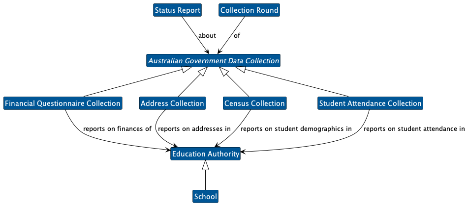 | A Collection Round is of an Australian Government Data Collection | CollectionRound, {FinancialQuestionnaireCollection, AddressCollection, CensusCollection, StudentAttendance} |