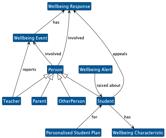 | A Student is involved in a Wellbeing Response | StudentPersonal, WellbeingResponse |