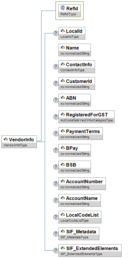 | VendorInfoRefId | M | Low | This object references the VendorInfo object being billed. | IdRefType | |