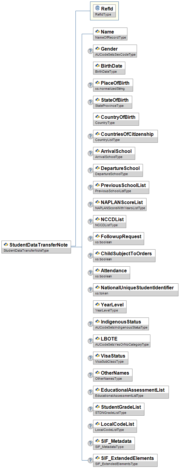 | StudentDataTransferNote | High | Object for Student Data Transfer Note, to communicate student movements between schools via a national Student Data Transfer Exchange. NOTE: as of the release of SIF-AU 3.5.0, the payload of the Student Data Transfer Protocol has not been approved by AESOC, and this object is being released as the current understanding of what it will contain. The object will be revised in future releases of SIF-AU if any changes to the payload are approved before it is finalised. | |||