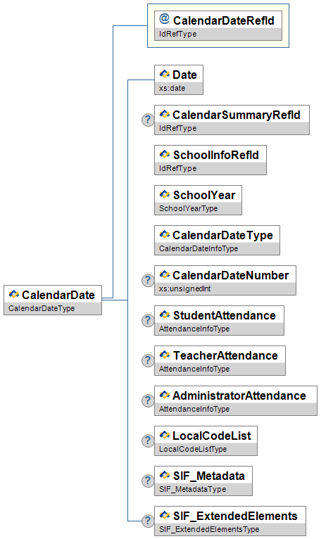 Figure 3.4.1-1: CalendarDate CalendarDate CalendarDateRefId Date CalendarSummaryRefId SchoolInfoRefId SchoolYear CalendarDateType CalendarDateNumber StudentAttendance TeacherAttendance AdministratorAttendance LocalCodeList SIF_Metadata SIF_ExtendedElements