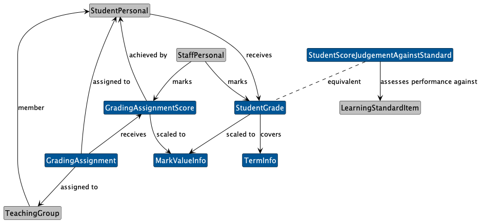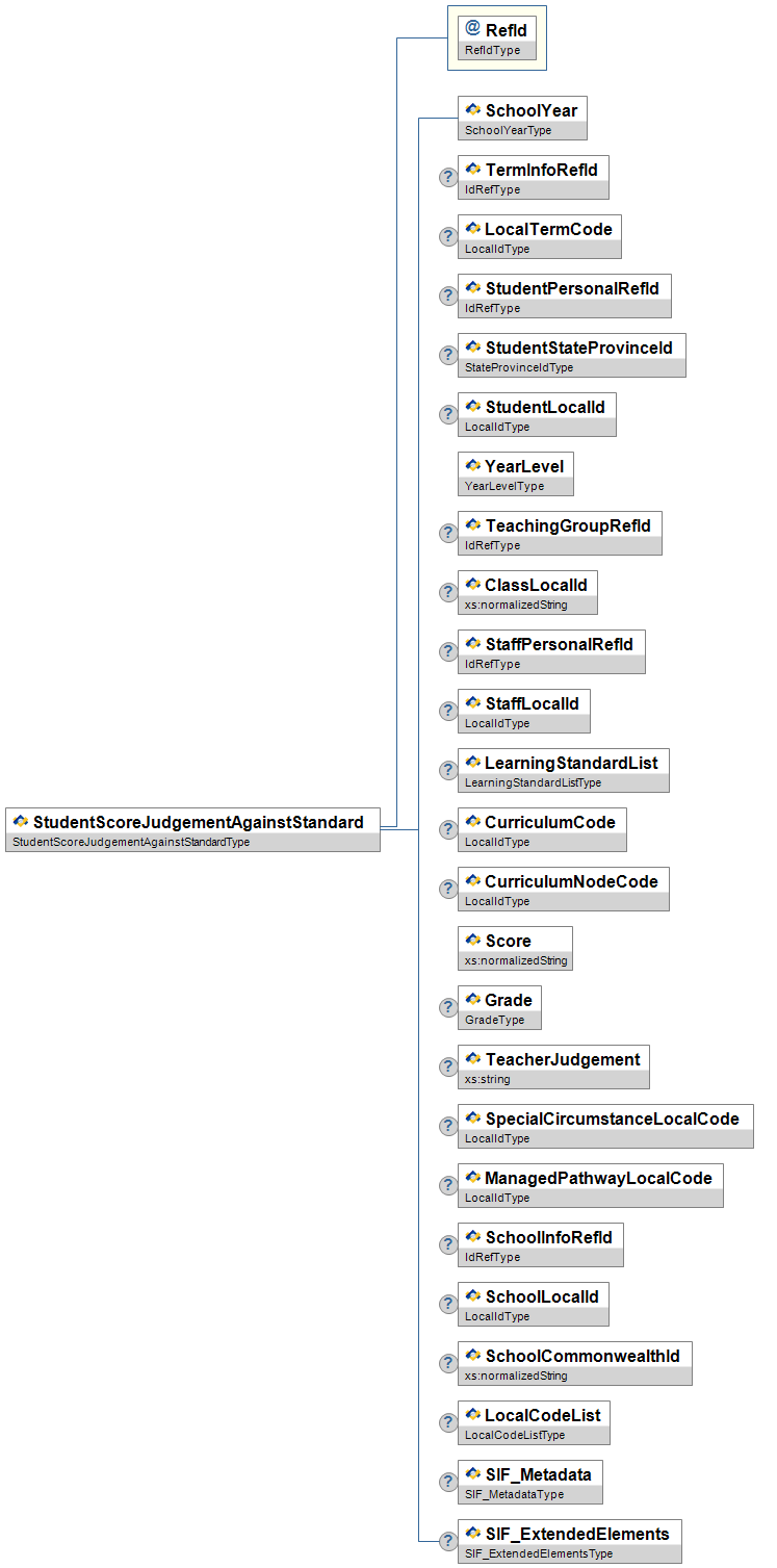 | StudentScoreJudgementAgainstStandard | High | This object serves to represent a student's score (score in the form of a teacher judgement against written achievement standards), which has been recorded against a curriculum node (the curriculum node belongs to a curriculum structure), which was taught as part of a school-defined class, during a specific reporting period. | |||
