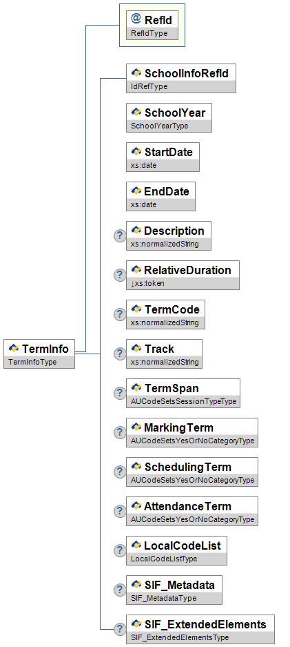 | AttendanceTerm | O | Low | Does this TermInfo represent an attendance term? | AUCodeSetsYesOrNoCategoryType | |||