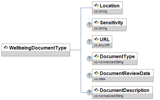 | WellbeingDocumentType | MR | Repeatable information of the location of any associated documents kept in relation. These include evidentiary documents, and action plans. | ||
