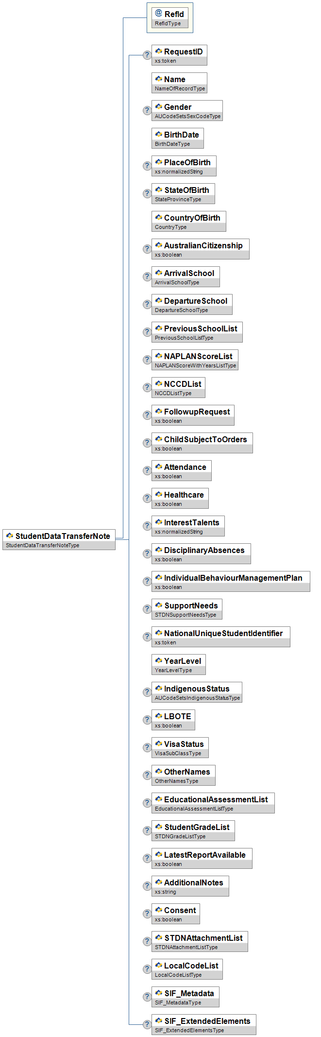 | StudentDataTransferNote | High | Object for Student Data Transfer Note, to communicate student movements between schools via a national Student Data Transfer Exchange. NOTE: as of the release of SIF-AU 3.5.0, the payload of the Student Data Transfer Protocol has not been approved by AESOC, and this object is being released as the current understanding of what it will contain. The object will be revised in future releases of SIF-AU if any changes to the payload are approved before it is finalised. | |||