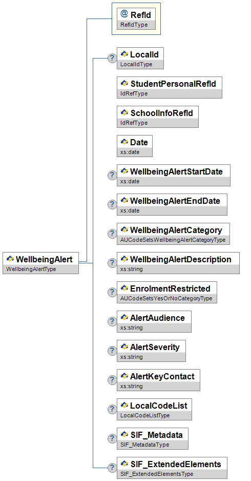 | WellbeingAlertCategory | C | High | Category of WellbeingAlert. | AUCodeSetsWellbeingAlertCategoryType | |
