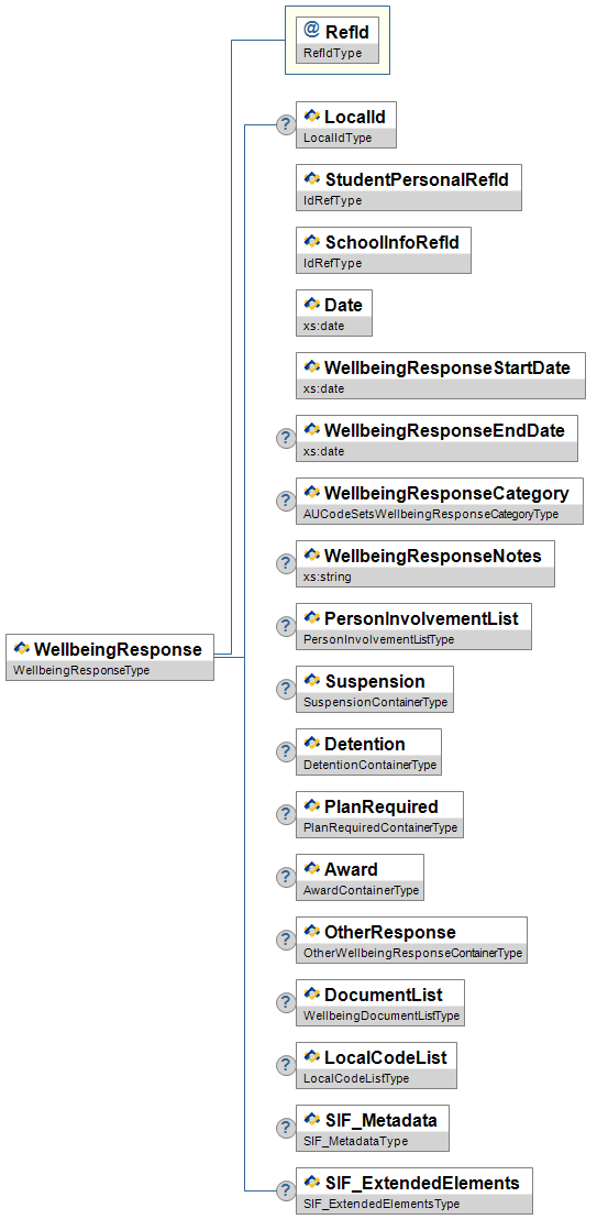 | WellbeingResponseRefId | O | Low | The ID (GUID) assigned to identify a Response that this object maybe linked to. | IdRefType | |