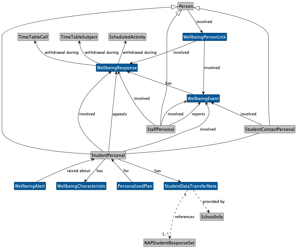 | WellbeingEvent | High | Event that impacts on a student's duty of care. This has been modelled by Sentral as an Incident, by CEOM as a behaviour support incident and by WA previously as an "Incident Report" but looking to move to terminology such as a "Wellbeing Event". There is an emphasis that this 'event' was needed to track both 'positive' and 'negative' behaviours and it not just the recording of a discipline incident or an accident. This event can be specific to a student, or a group of students, and is not global (e.g. a pandemic). Where an event involves more than one student, they can be listed in the person's involved or if part of a group, can be linked via a WellbeingPersonLink Object, new to the 3.4.5 Data Model. Where the event has an impact on a student's wellbeing an individual record for each student should be generated, or linked via WellbeingPersonLink. E.g. where a student is reporting that another student fell off his bike, then the reporting student is listed as a person involved, or where a student is part of a group, they can be connected via WellbeingPersonLink. | |||